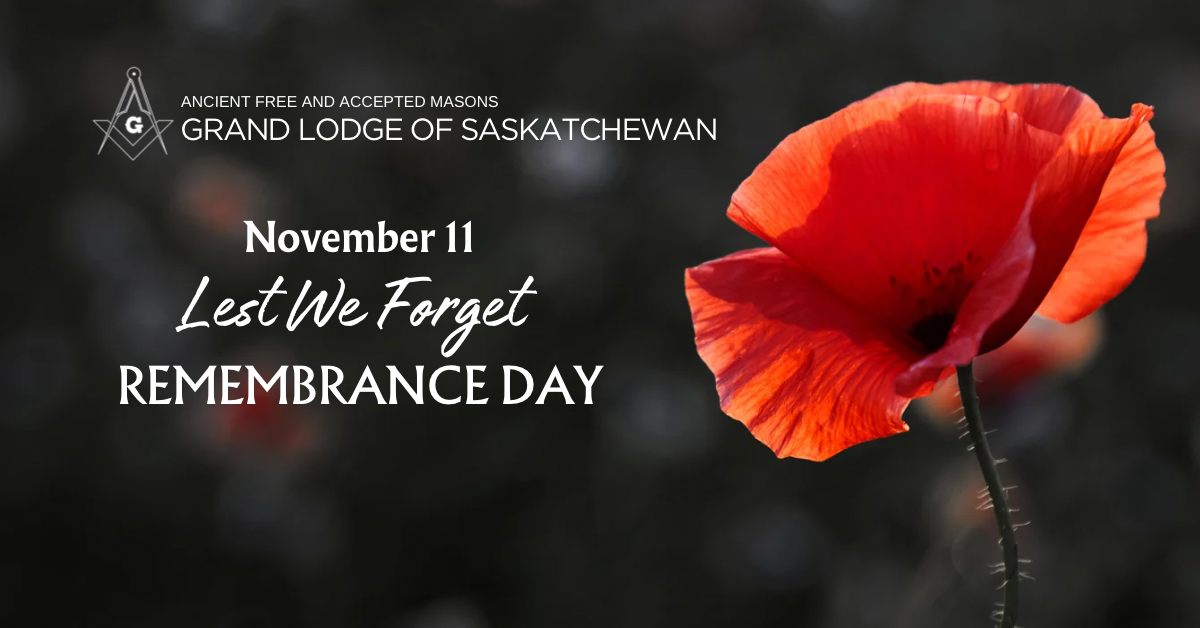 Greetings brethren, as we begin November let us pause to remember those of our brethren who served their King and Country and helped bring Peace to the world. For those who paid the ultimate sacrifice and those who returned home to build this Nation to where it is today, mere words can not express the gratitude to them for their efforts. To those Brethen that have served and are still serving, Thank you on behalf of the brethren of the Grand Lodge of Saskatchewan for your service to this Country.